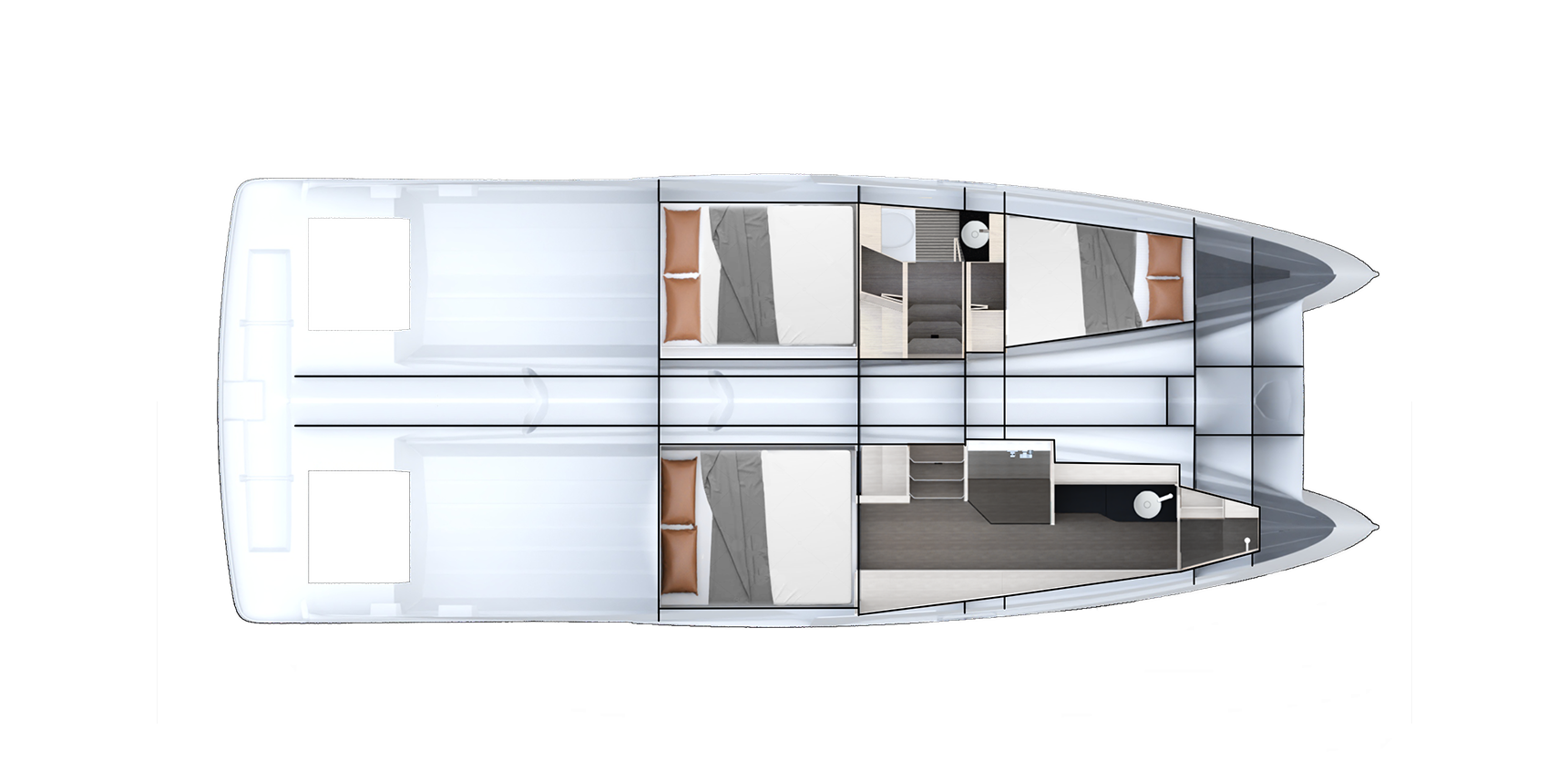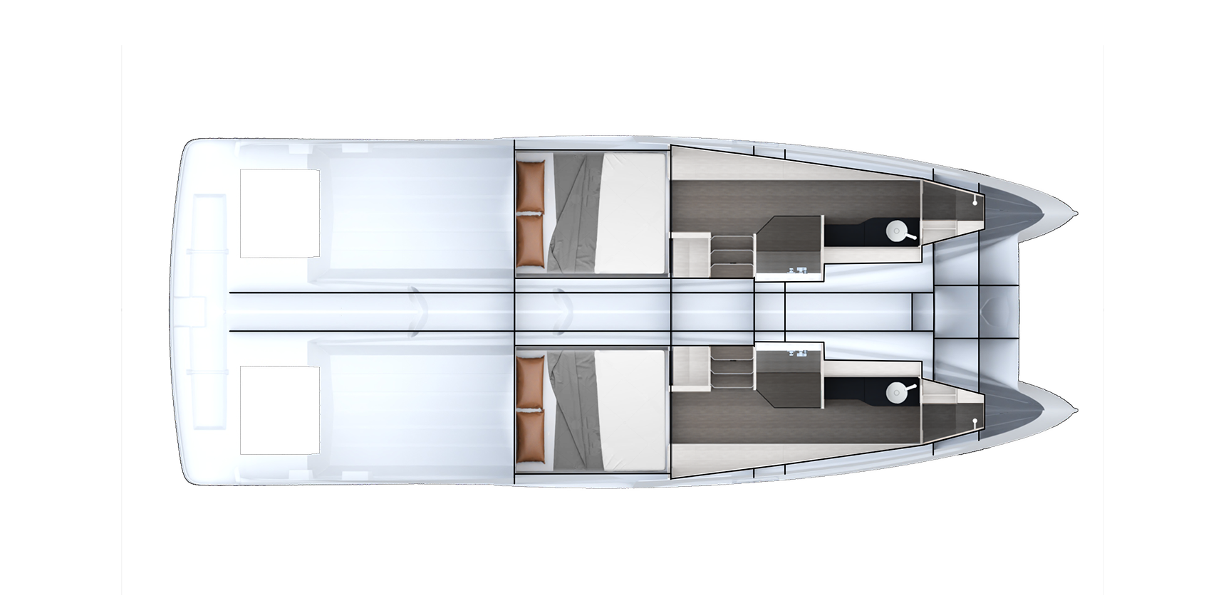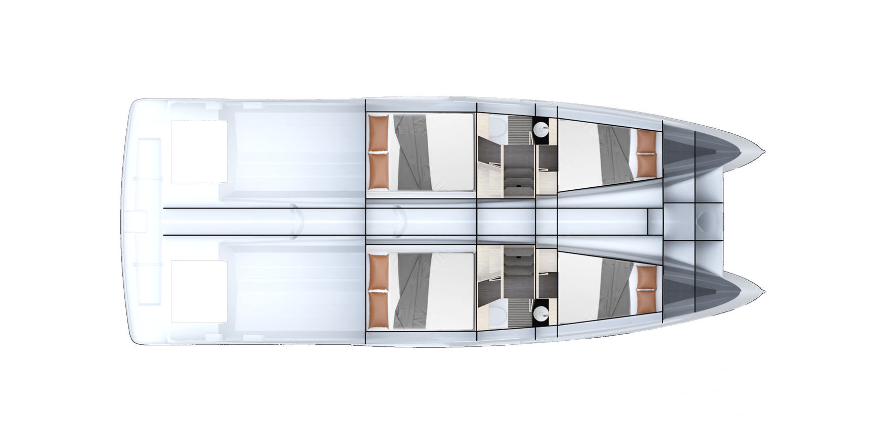 Left and right hull: double bed, wooden floor panels, wooden furniture, luxury bedroom with separate shower, LED lighting, sockets 230V & USB, reading lamps, drawer under bed, textile upholstery, sides and headliner made of upholstered panels, storage space, blinds, vendeck floor in shower.